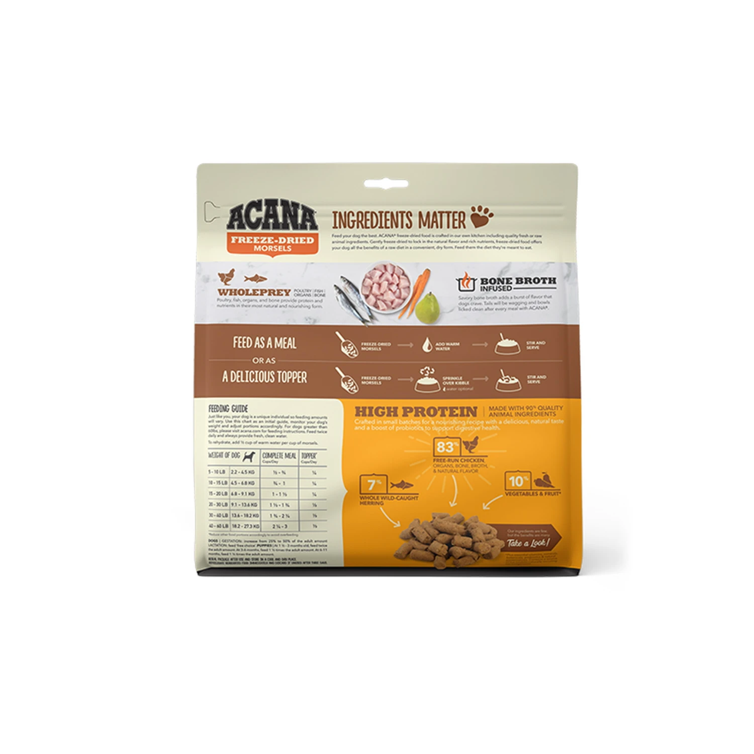 With all the benefits of raw nutrition and none of the mess, ACANA Freeze-Dried Food, Free-Run Chicken Recipe satisfies your dog’s natural cravings in a convenient, freeze-dried form. Made from 90% quality animal protein from free-run chicken and infused with delicious bone broth, you can serve morsels on their own or as a topper at mealtime.