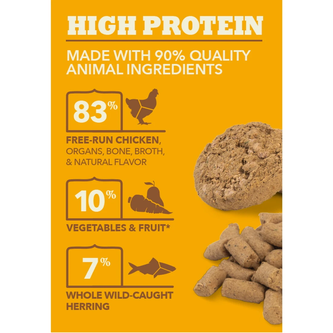 - 90% of total protein from animal ingredients