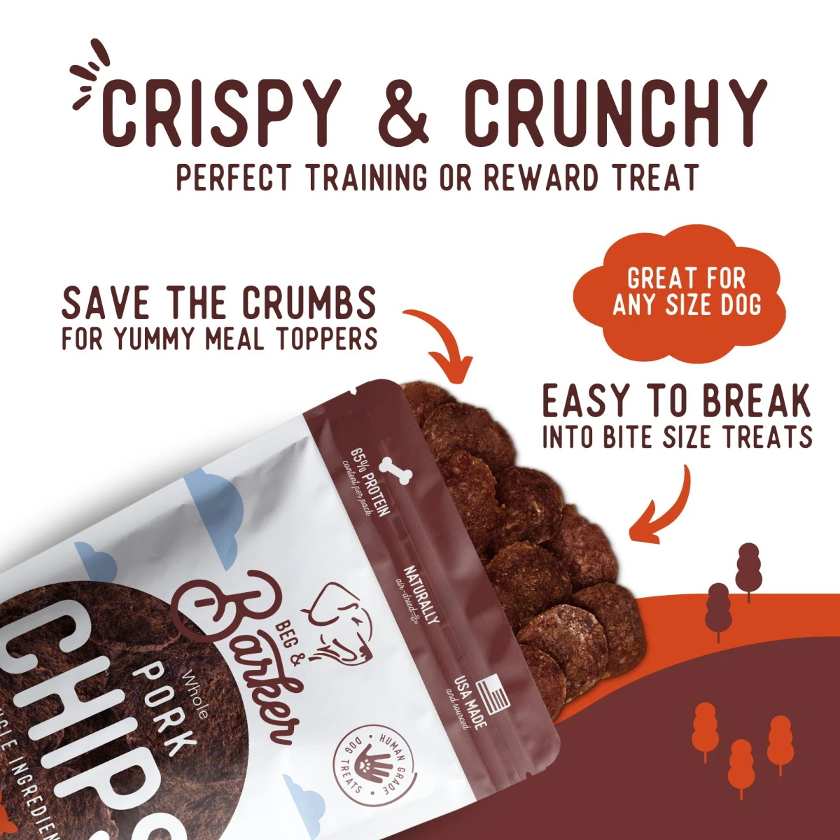 Beg & Barker Whole Pork Chips are proudly crafted with 100% human grade pork heart and air-dried to preserve the nutrients and flavors of the meat. This treat is proudly made in small batches at their own manufacturing facility. It’s so good, your pup will beg and bark for these delicious snacks.