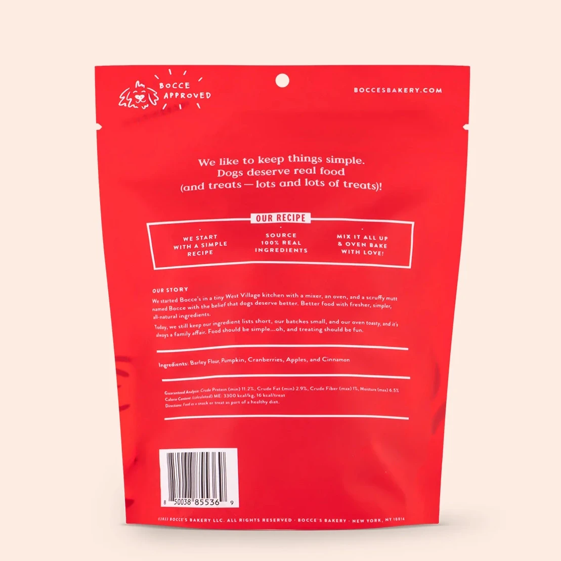 Made with organic, allergy-friendly, low-fat, ingredients (pumpkin, cranberries & apples!) and packaged in recyclable bags – this is what treating was meant to be. Bocce’s Bakery biscuits are proudly made in New York, USA using Human-Grade ingredients.