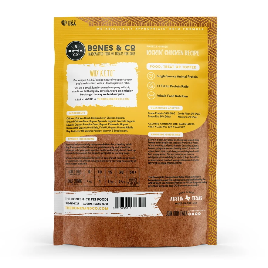 Bones & Co. Freeze-Dried Temptin Turkey Recipe is made with 95% poultry, organs and bone, and a 1:1 fat to protein ratio for metabolically appropriate, 100% complete and balanced canine nutrition. Use as a food, treat or topper.