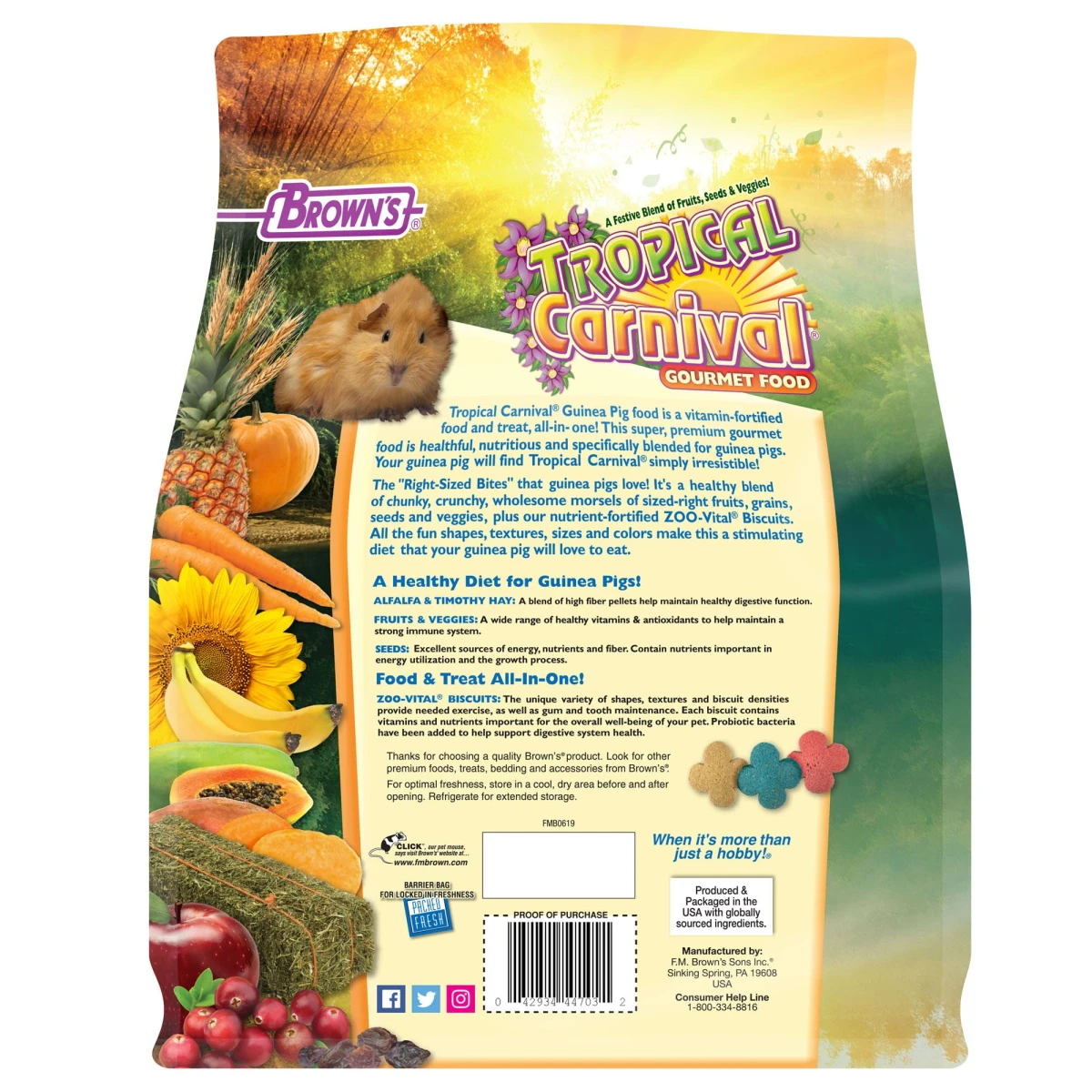 Tropical Carnival Guinea Pig food is a vitamin-fortified food and treat, all-in-one. This premium gourmet food is nutritious and specially blended for the daily dietary needs of guinea pigs, including our alfalfa and timothy hay pellets formulated for optimum digestion. With added Vitamin C to help maintain a strong immune system. Your guinea pigs will find Tropical Carnival simply irresistible.