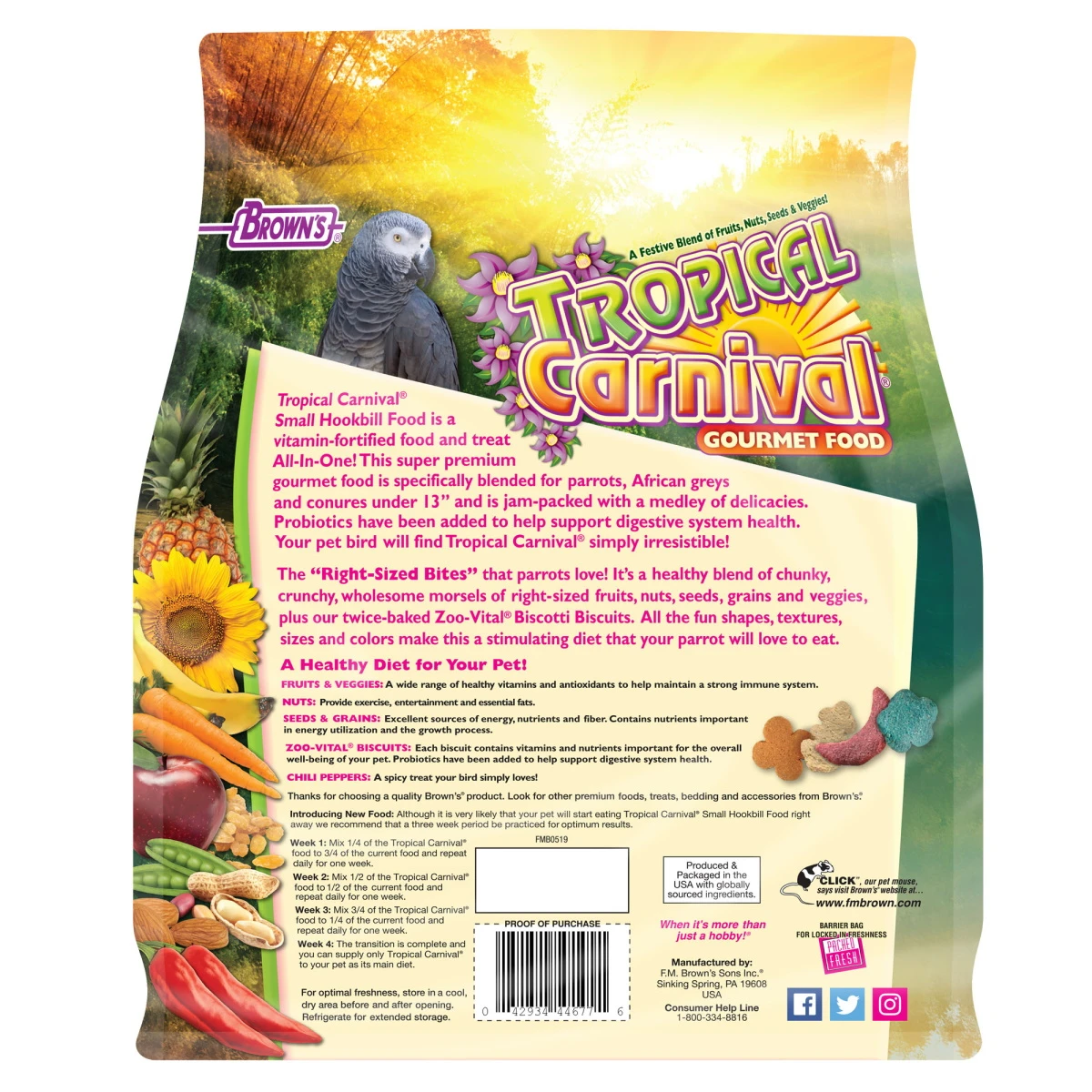 Tropical Carnival is a natural, vitamin-nutrient-fortified daily diet. It’s a food and treat, all-in-one. Our super premium gourmet food is specifically formulated to help Small Hookbills thrive. We’ve jam-packed it with a mix of fruits, nuts, vegetables and wholesome seeds and grains. Tropical Carnival includes natural preservatives to ensure freshness. Omega Fatty Acids, antioxidants and beneficial bacteria help support good digestion. Your Small Hookbills will find Tropical Carnival simply irresistible.
