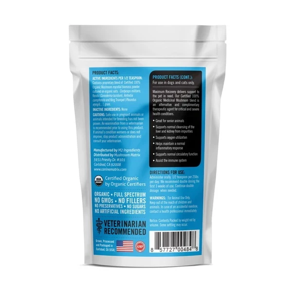 Canine Matrix MRM Recovery Mushroom formula is formulated with the senior dog in mind. It delivers support to keep your pet Healthy and Happy! This Certified 100% Organic Medicinal Mushroom blend is formulated as an Alternative and Complimentary therapeutic agent for critical and chronic health conditions. It is made from raw, whole food, organic, human grade ingredients, which can help senior dogs during stages of rehabilitation, recovery or trauma. This veterinarian recommended supplement is gmo-free, and contains No fillers, preservatives or artificial ingredients. It is proudly grown, processed and packaged in Carlsbad, CA.