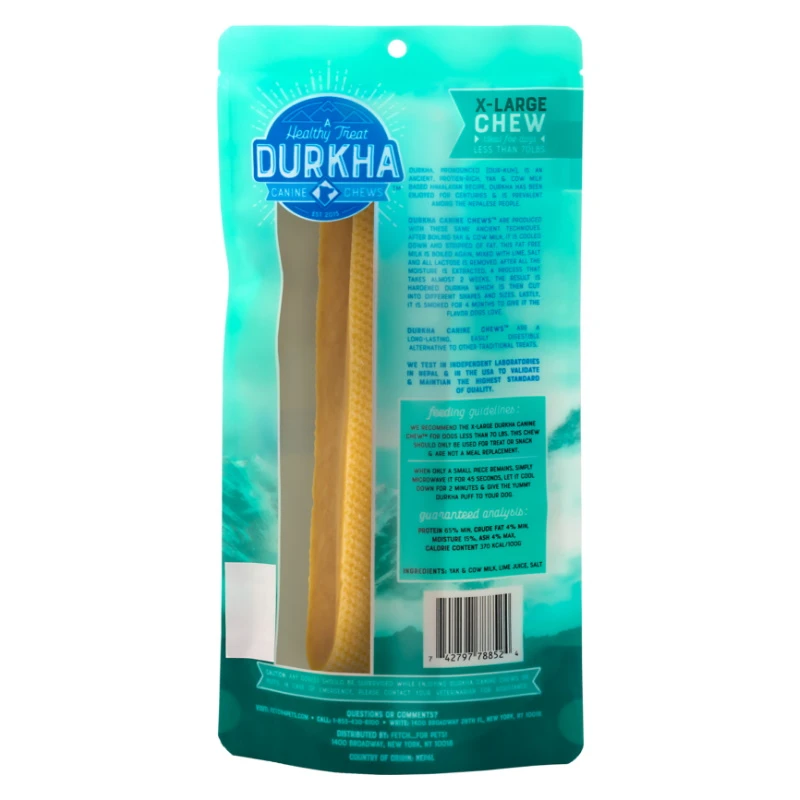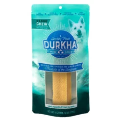 Durkha is an ancient, protein-rich Yak and Cow Milk based Himalayan recipe. Durkha has been enjoyed for centuries and is prevalent among the Himalayan people. Durkha Canine Chews are produced with these same ancient techniques. After boiling Yak and Cow Milk, it’s cooled down and stripped of fat. This fat free milk is boiled again, mixed with Lime, Salt, and all lactose is removed. After all the moisture is extracted, a process which takes almost two weeks, the result is hardened Durkha which is then cut in different sizes and shapes. Lastly it is smoked for 4 months to give it the flavor your dog loves. Durkha Dog Chews are a long lasting & easily digestible alternative to other chews. It’s proudly made in Nepal