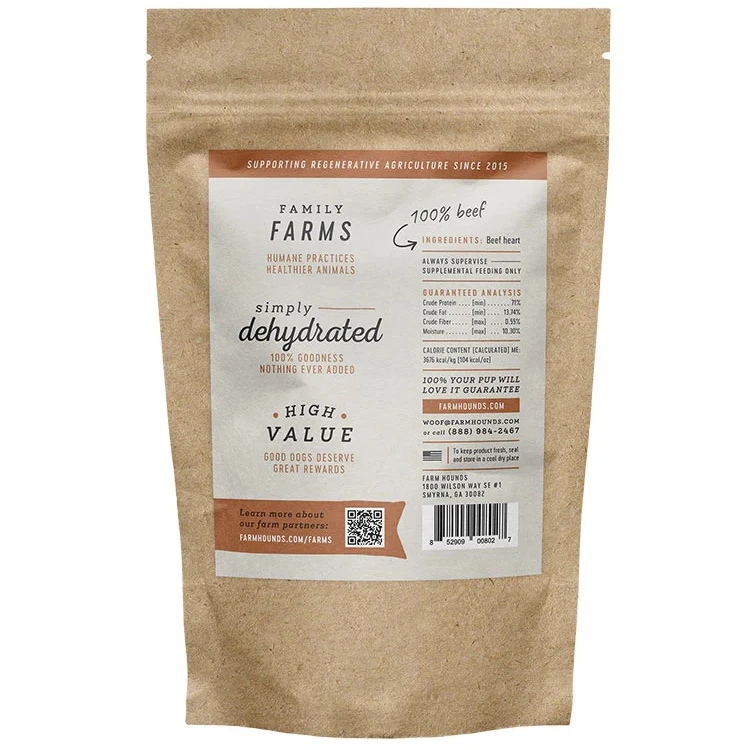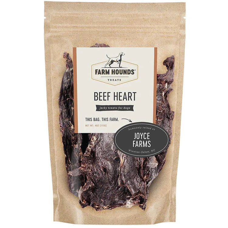 Farm Hounds Beef Heart is a nutrient packed snack and commonly referred to as a superfood. It’s gently dehydrated, has a crunchy texture, and is a high value snack. The beef is sourced from Joyce Farms in Winston-Salem, NC which is a family-owned business in operation since 1962. They are a small, traditional family farm that humanely raises their animals in a pasture environment. The beef is certified humane, and raised without the use of antibiotics, chemicals, hormones, or pesticides. Farm Hounds is dedicated to providing the highest quality dog treats that you can trust.