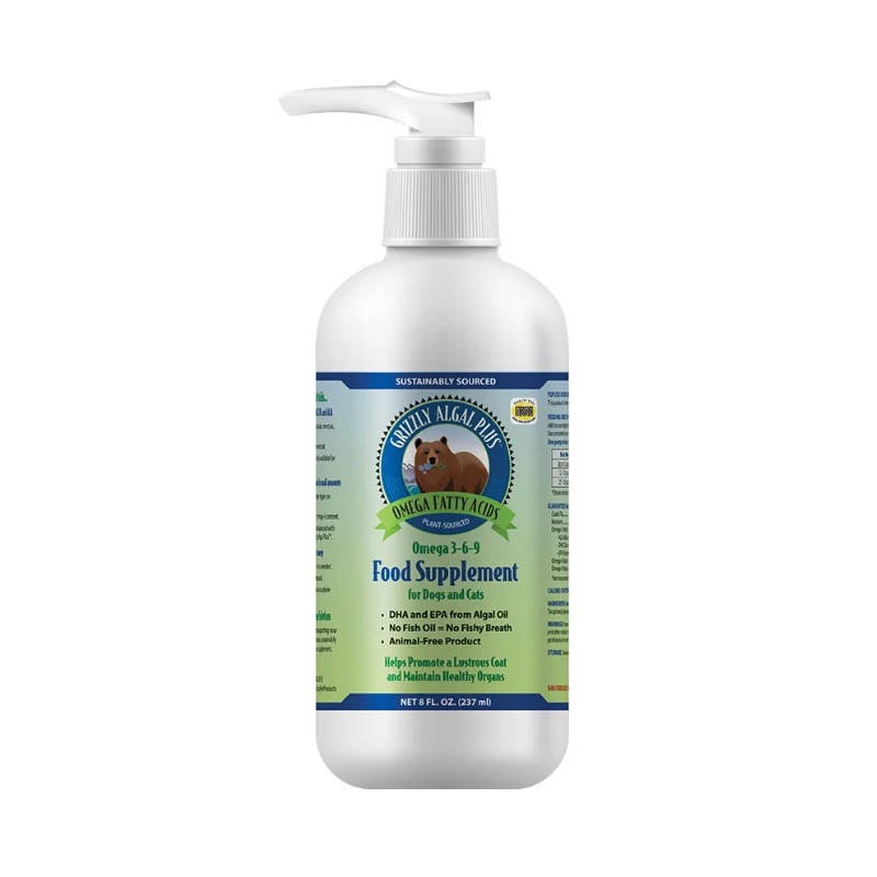 Grizzly Algal Plus Oil contains EPA and DHA, which help maintain a pet’s healthy skin, lustrous coat, healthy joints and a sound cardiovascular system. DHA has also been shown to be very beneficial for the nervous system, eyes, and for maintaining a higher fertility status.