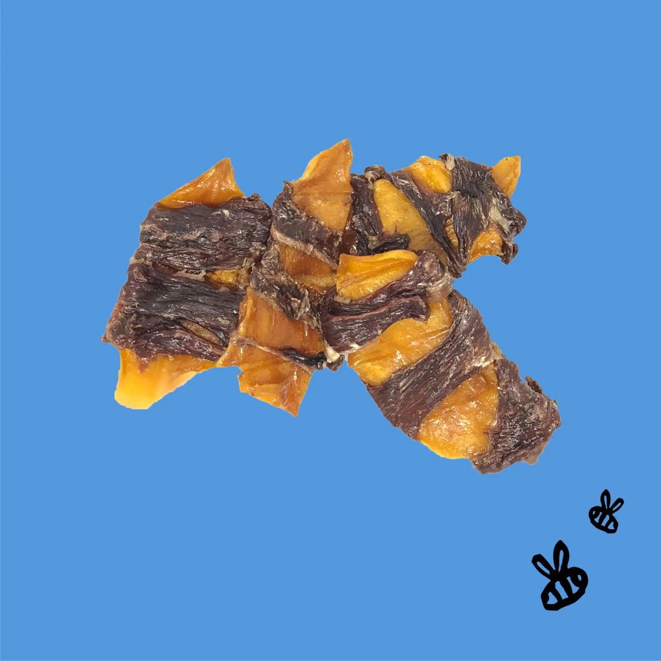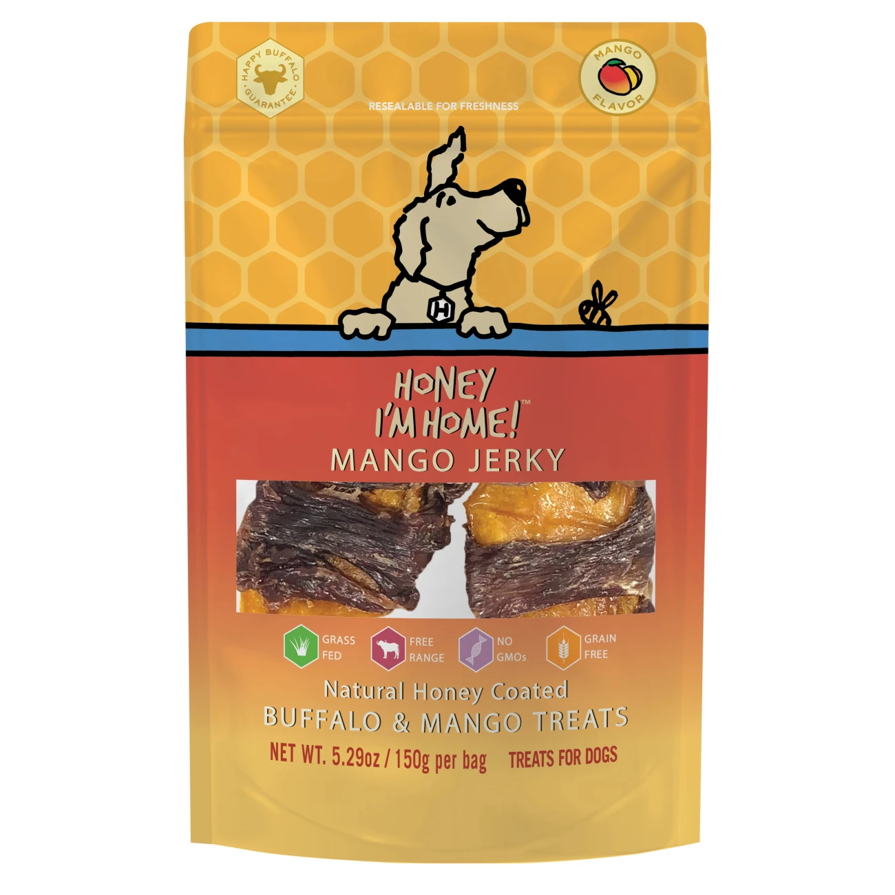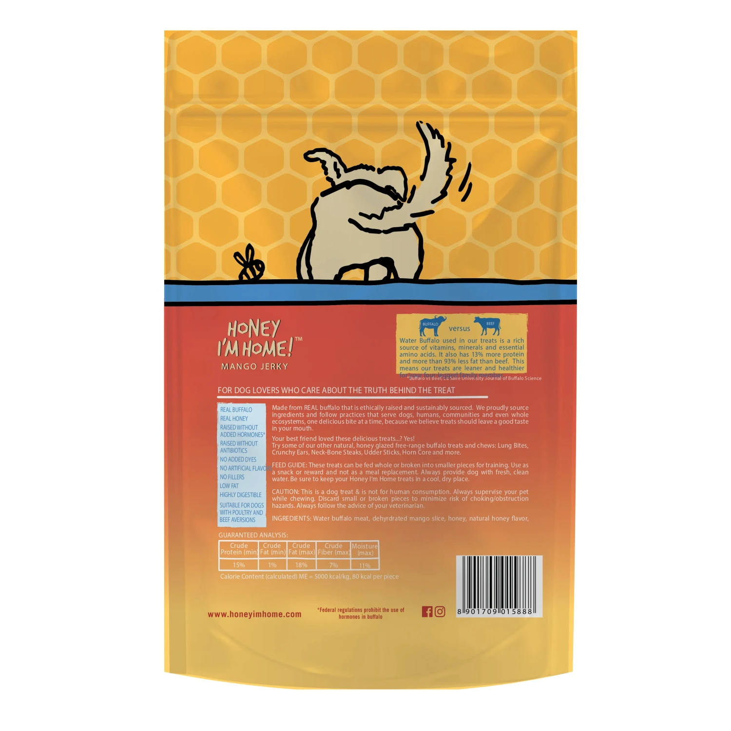 When jerky isn’t enough you can turn to Honey I’m Home Mango Jerky. Made with dehydrated mango slices that are wrapped in delicious water buffalo jerky, these treats are sure to delight even the pickiest of dogs! These treats rich in flavor, high in protein and low in fat. This protein rich snack is made using Free-Range, Grass-Fed Water Buffalo and is coated with real honey to provide great flavor and nutrition. The buffalo used is raised naturally with no added antibiotics or Hormones.