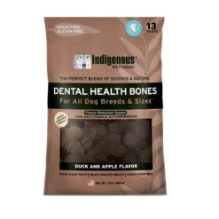Indigenous Pet Products Dental Health Bones are a plaque reduction system that works to clean teeth and freshen breath. It’s highly digestible and features a patented shape which cleans teeth during natural chewing action. It is edible, grain-free, GMO-Free and now contains probiotics to support digestive and immune health. Each piece features nutrient rich kelp which is harvested from the clean, cold North Atlantic seas of Canada, Iceland, and Norway. Indigenous Pet proudly produces their products in the USA!