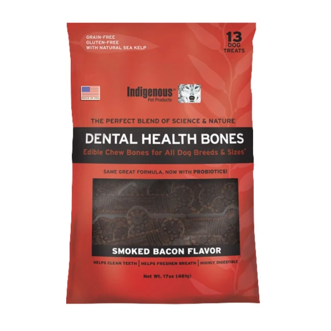 Indigenous Pet Products Dental Bones are grain-free chews that can help promote good dental health. They can assist in cleaning teeth and freshening breath, while fighting plaque and tartar build-up. These highly digestible chews are GMO-Free and have a patented design. Each delicious piece features nutrient rich kelp which is harvested from the clean, cold North Atlantic seas of Canada, Iceland, and Norway. The salmon oil provides a natural source of omega 3 fatty acids. Indigenous Pet proudly produces their products in the USA!
