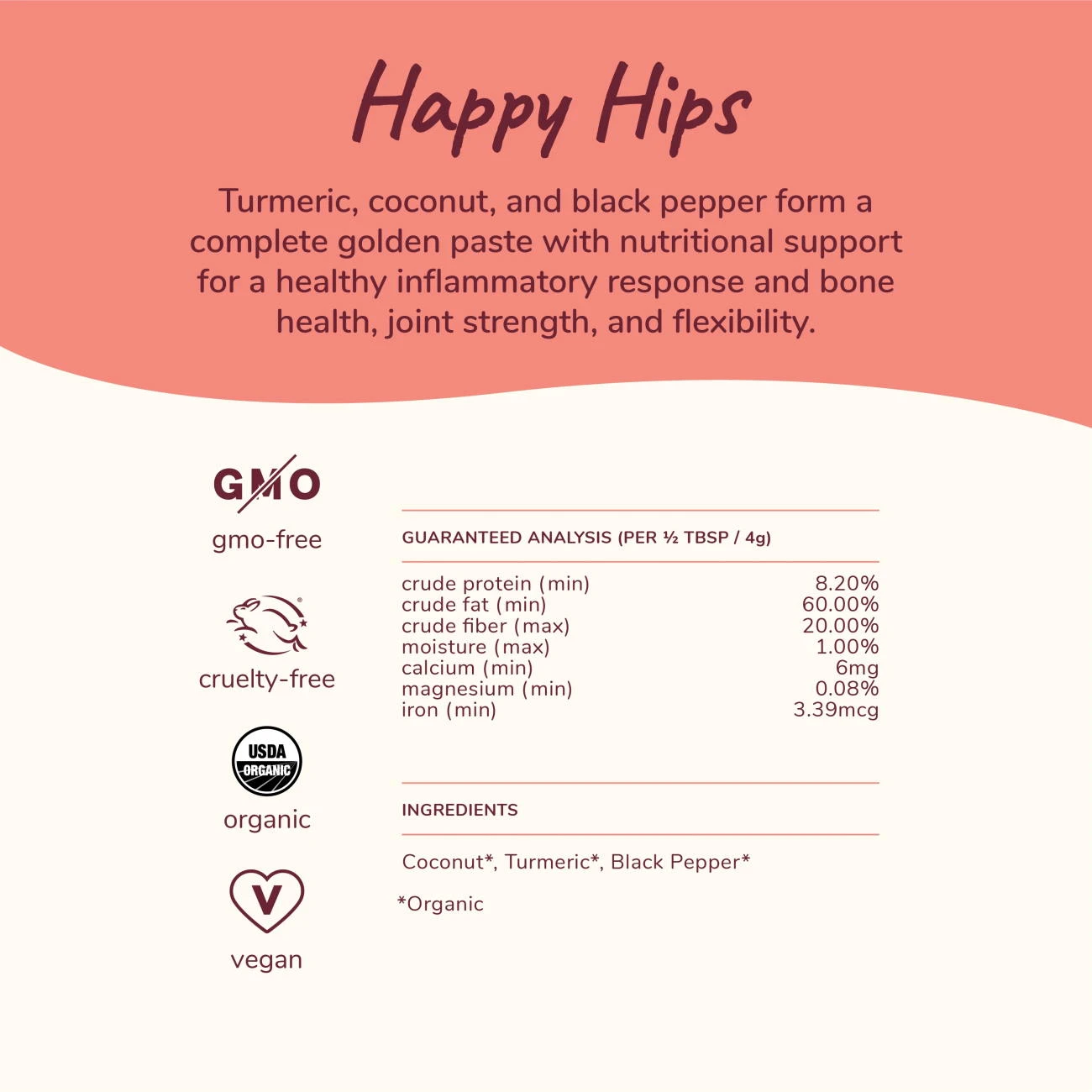 - Happy Hips: Turmeric, coconut, and black pepper form a complete golden paste with nutritional support for a healthy inflammatory response and bone health, joint strength, and flexibility.