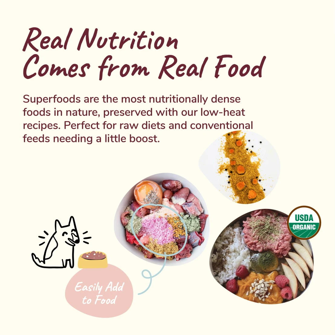 - Real Superfoods: Pets love these supplements because they’re made with only real superfoods and nothing else. No GMOs and no grains. They taste good and can be easily sprinkled on top of any type of diet.