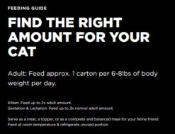 Feeding Guidelines: Feed according to the age, size, and activity of your cat. Feed at room temperature and refrigerate unused portion. Your cat should always have access to clean fresh water.