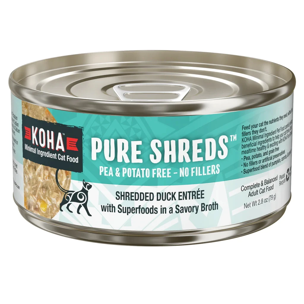 KOHA Pure Shreds Shredded Duck Entrée for Cats is a delicious single meat shredded recipe in a savory broth. Cats go crazy for the shredded texture and the tasty superfood blend of pumpkin, carrots, & spinach. This low fat entrée is an excellent choice for weight control. Our Pure Shreds Shredded Duck Entrée does not contain any unnecessary fillers or artificial preservatives or carb-loaded fillers like peas, potatoes, and grains that can lead to digestive issues.
