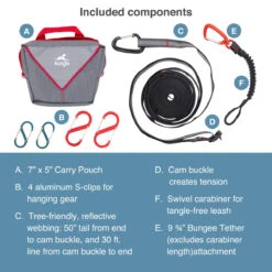 - All in one system: includes 30ft of zipline, 9 3/4″ bungee tether, 4 aluminum s-clips, and 7″ x 5″ carry pouch