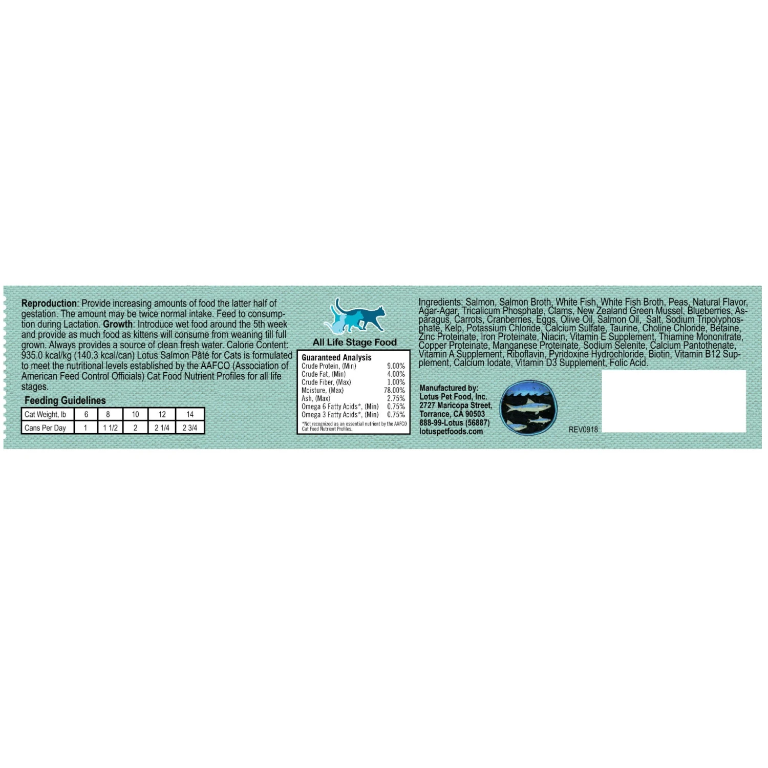 Lotus Salmon Pate is a wholesome, natural diet for your cat. It’s made using real salmon as the main ingredient, and for added nutrition and flavor, it also contains Asparagus, Carrots, Cranberries, and Kelp. It’s made in small batches and features cans with non-BPA lining. Lotus Canned Cat Food is proudly made in the USA.