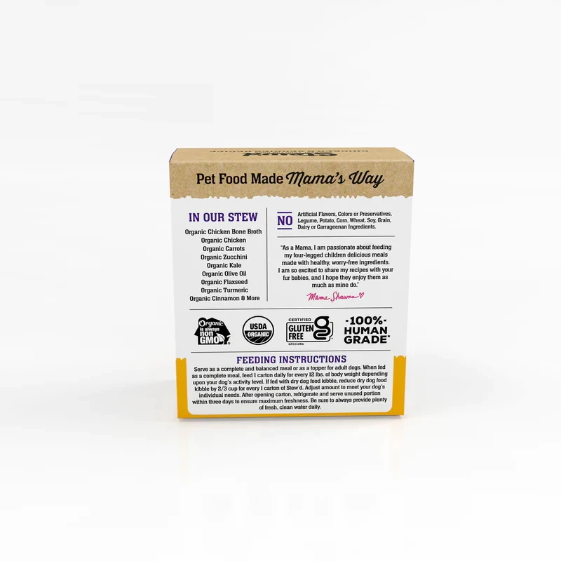 Mama Shawna’s “Stew’d” Chicken & Veggies recipe is a wholesome food featuring 100%, Organic, Human-Grade Ingredients. This tasty recipe is stew’d according to FDA human food regulations using the same quality ingredients that we would eat ourselves. Although these stews are intended for your pet to eat (not you), they contain no animal feed grade ingredients and are made in an FDA & USDA Organic Certified inspected facility. So not only can your fur babies taste the Mama Shawna difference, but you can feel great about feeding them this food. As the saying goes, Mama knows best!
