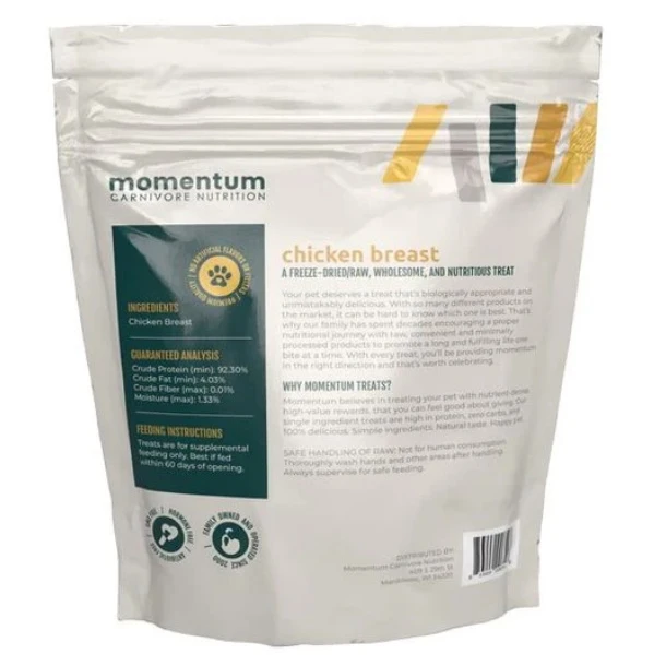 Chicken Breast is a lean protein which is loaded with flavor. It is a great source of phosphorus which may help in the formation of bones and teeth, and is a crucial part of cell and tissue repair. Momentum sources this high quality chicken from the United States and Canada. It gently freeze-dried to retain the beneficial nutrients. This single ingredient treat that is great for snacking, or to supplement your dogs current diet. It also can be crumbled on top of kibble or other food to help encourage picky eaters. The chickens are sourced form USDA inspected facilities and has no fillers or preservatives. Momentum Carnivore Nutrition is a family owned business, which has been providing quality, fresh treats since 2001.