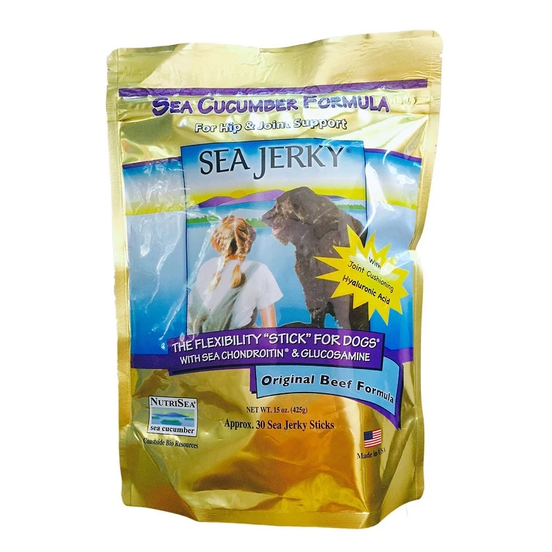 Many dogs have daily struggles with joint pain and most of the time it is caused by age, breed type or trauma. NutriSea Sea Jerky is made with ingredients that boost joint health. It is crafted using Sea Cucumber (Sea Chondroitin) along with Glucosamine to promote cartilage growth and lubrication. This variety of sea jerky features real beef provides a great flavor that fido will enjoy! The 15-ounce bag contains bite-sized squares that are easy to feed.