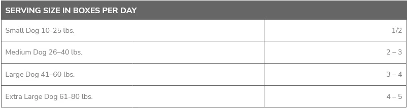 Feeding Directions: Gently warm + serve or tear open + pour. This is a general guideline for Adult Dog’s calorie requirements. Not intended for puppies.