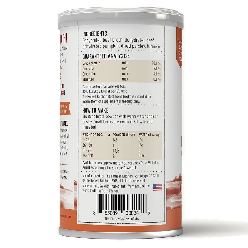 The Honest Kitchen Beef Bone Broth is simple to prepare. Just add warm water to provide your dog’s with a nourishing drink, pour over kibble to create as a delectable gravy, or it can be used to rehydrate an Honest Kitchen meal. Pumpkin, parsley, and turmeric are included in this recipe, which adds great flavor and nutrition. The Honest Kitchen Daily Boosters are made in the USA using 100% human-grade ingredients at a human food facility.