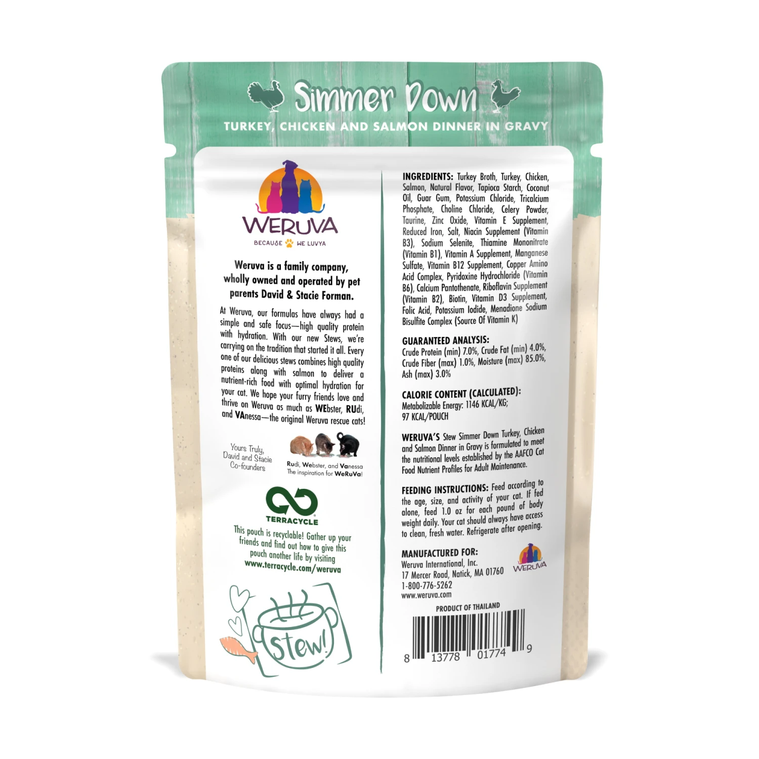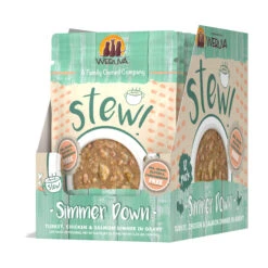 Weruva Classic Cat Simmer Down is a wholesome, hearty stew featuring turkey, chicken and salmon. It’s a complete diet with paw-lickin’ flavor.