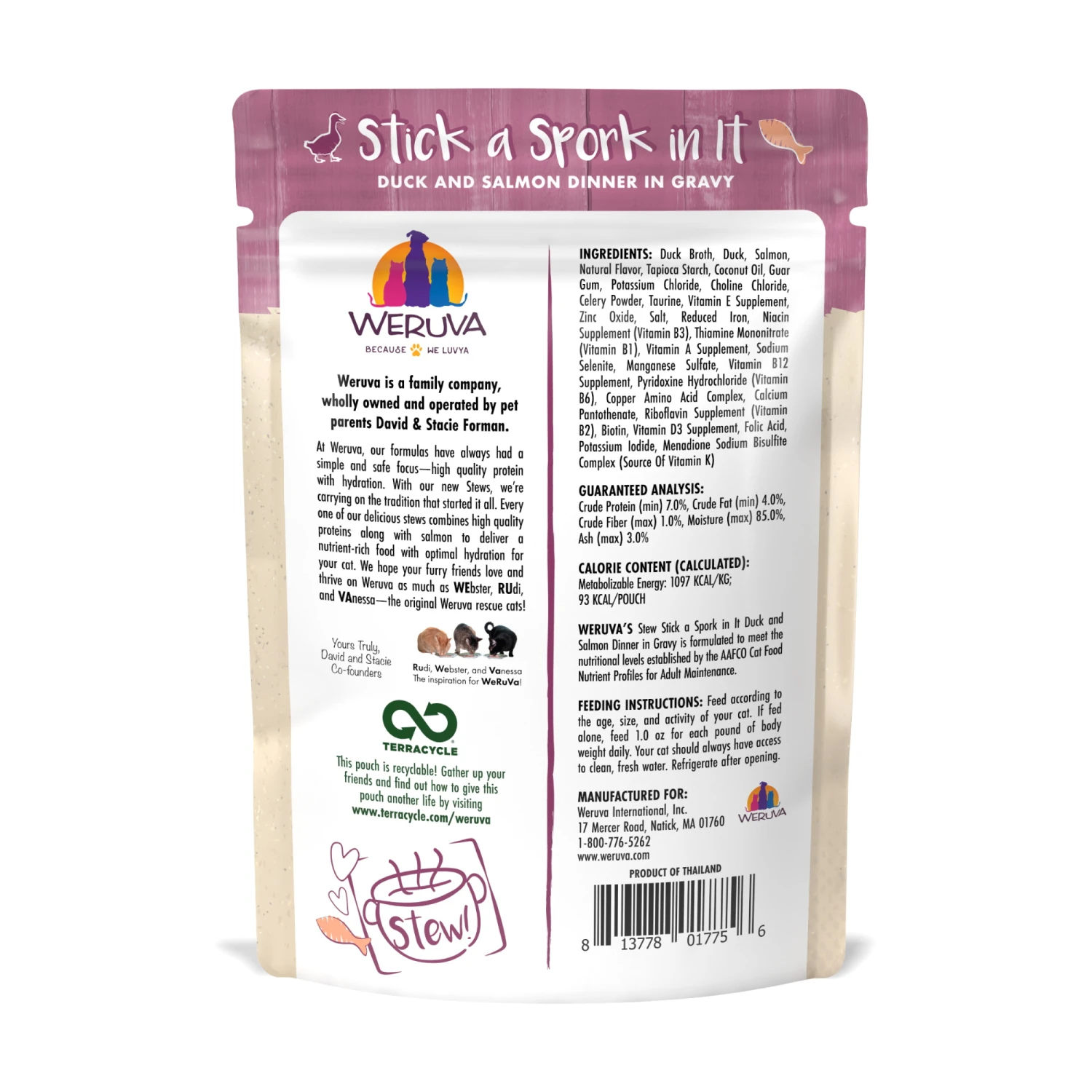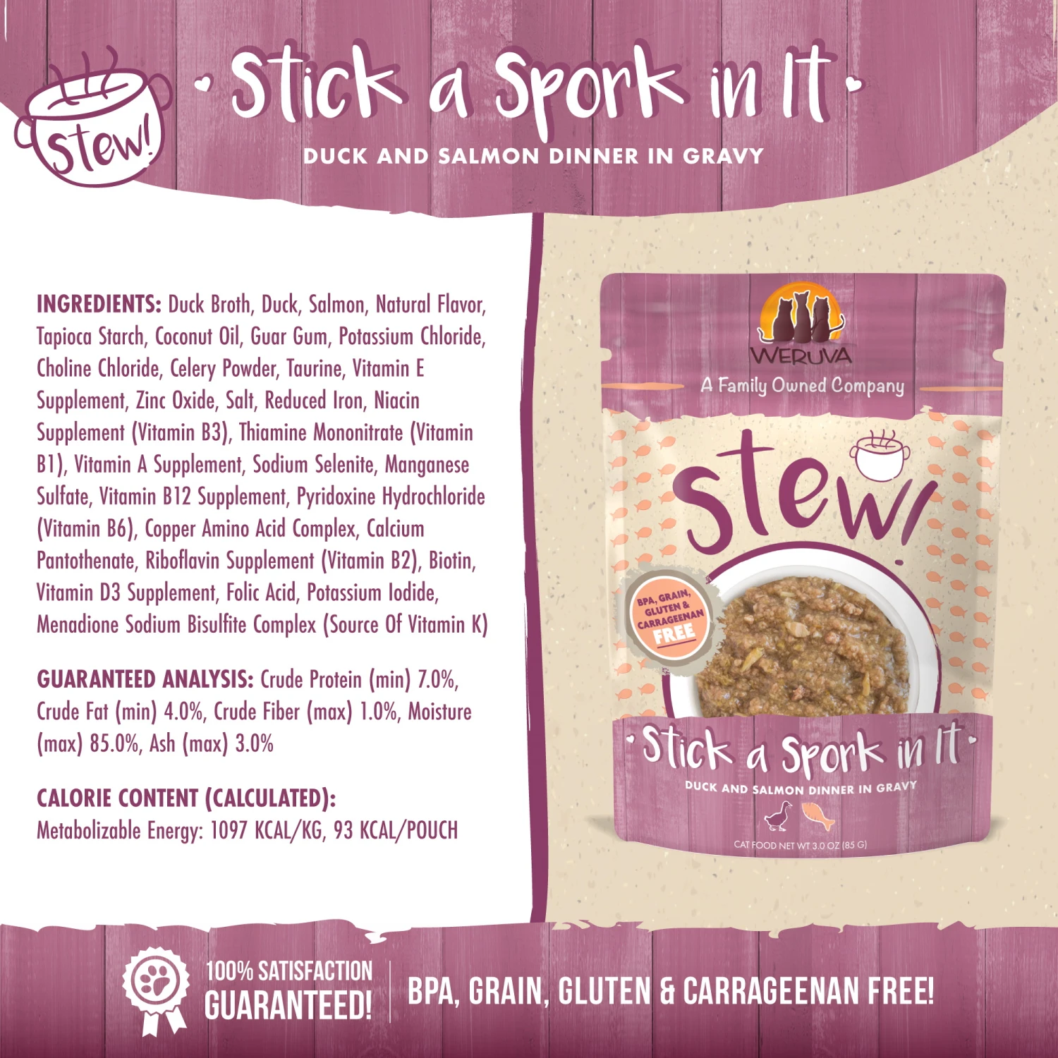 Weruva Classic Cat Stick a Spork in it is sure to give your furbaby a wholesome stew loaded with flavor. Each packet features Duck and Salmon as main ingredients, and provides a complete diet for your feline.