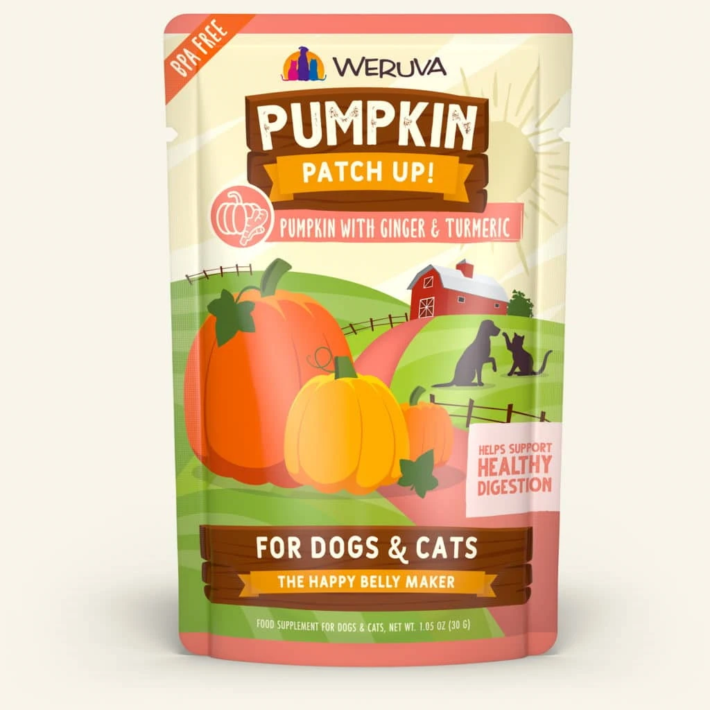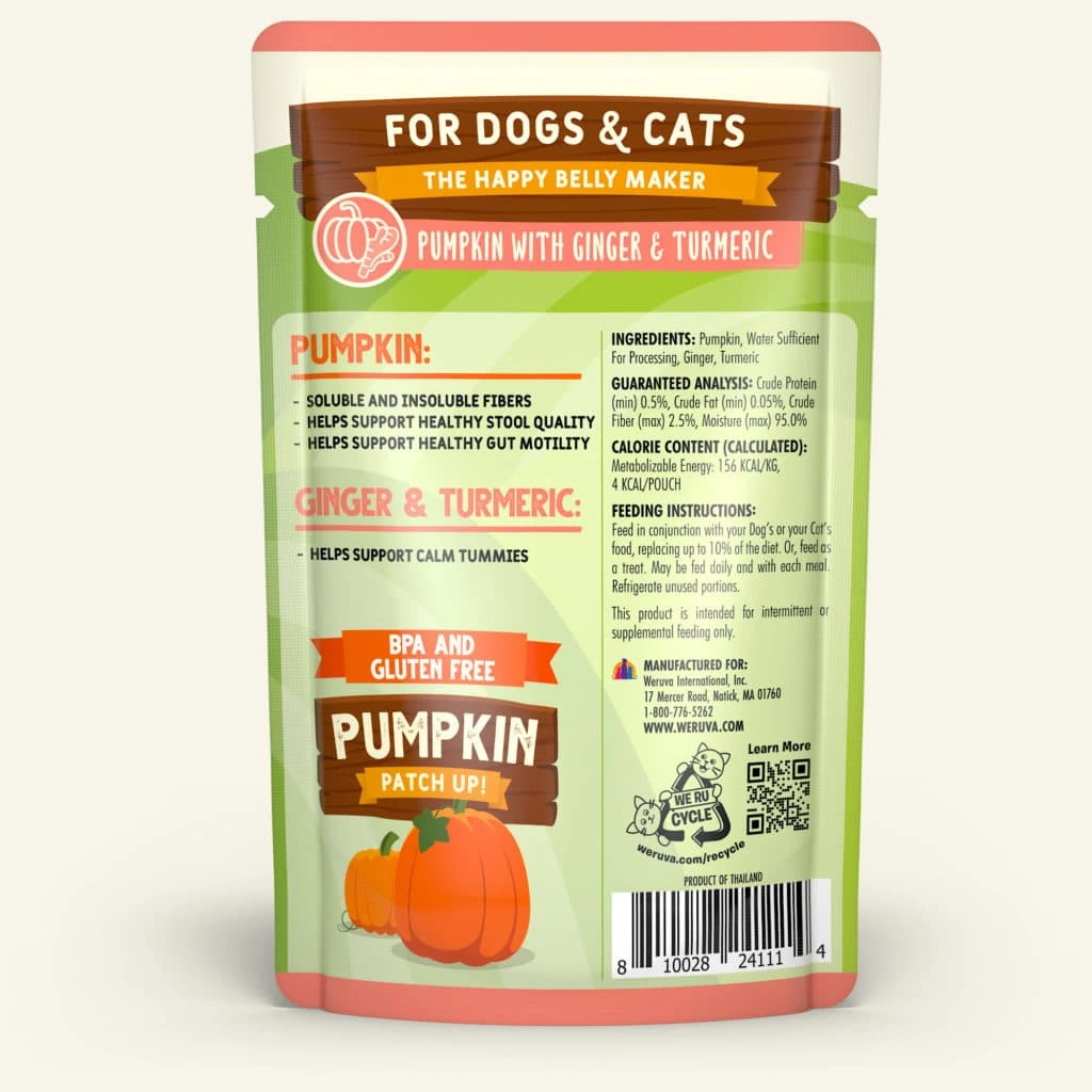 Weruva Pumpkin Patch Up! provides your furry friends with support for the digestive system. It’s a great source of healthy soluble and insoluble fibers and combines the healthy digestive benefits of pumpkin in an easy to serve pouch. The added ginger and turmeric help to calm tummies and reduce inflammation with natural antioxidants!
