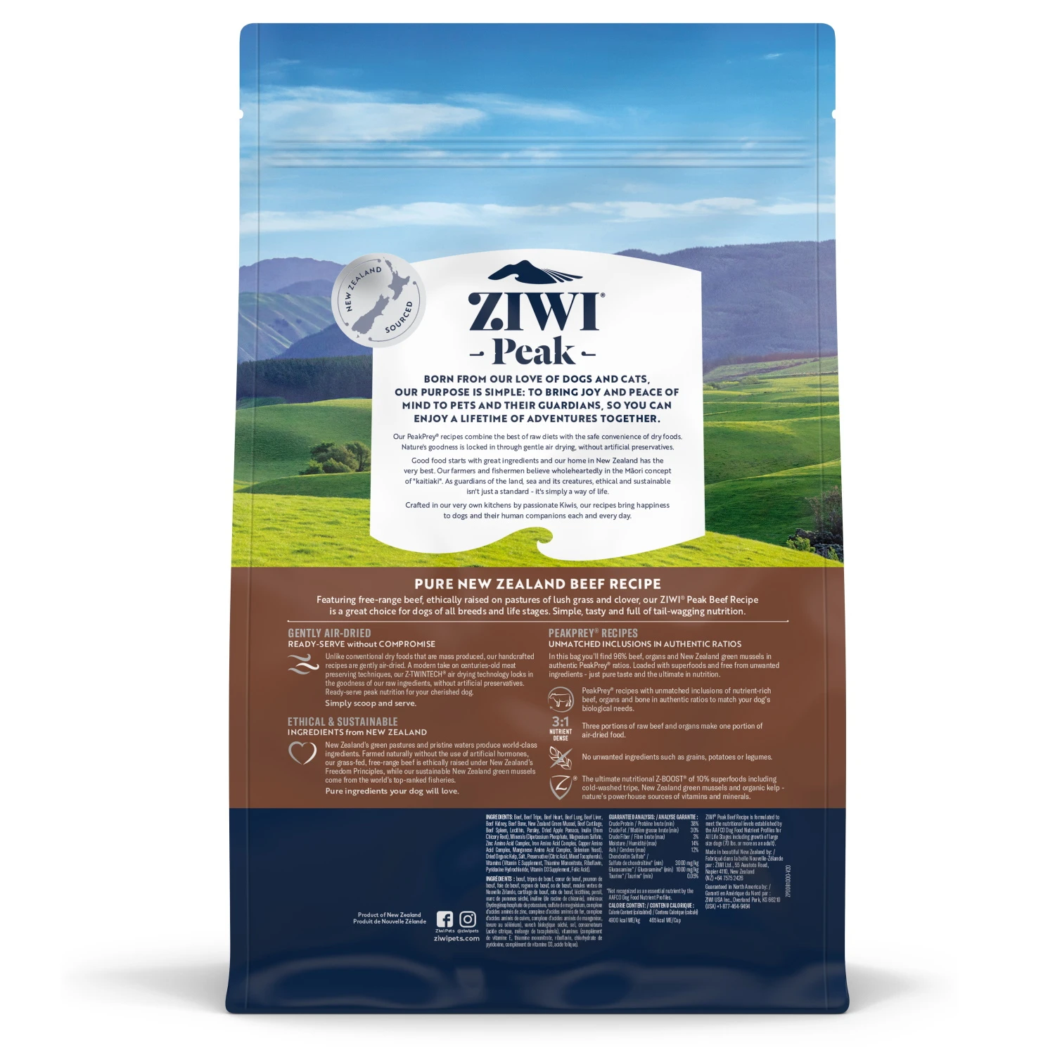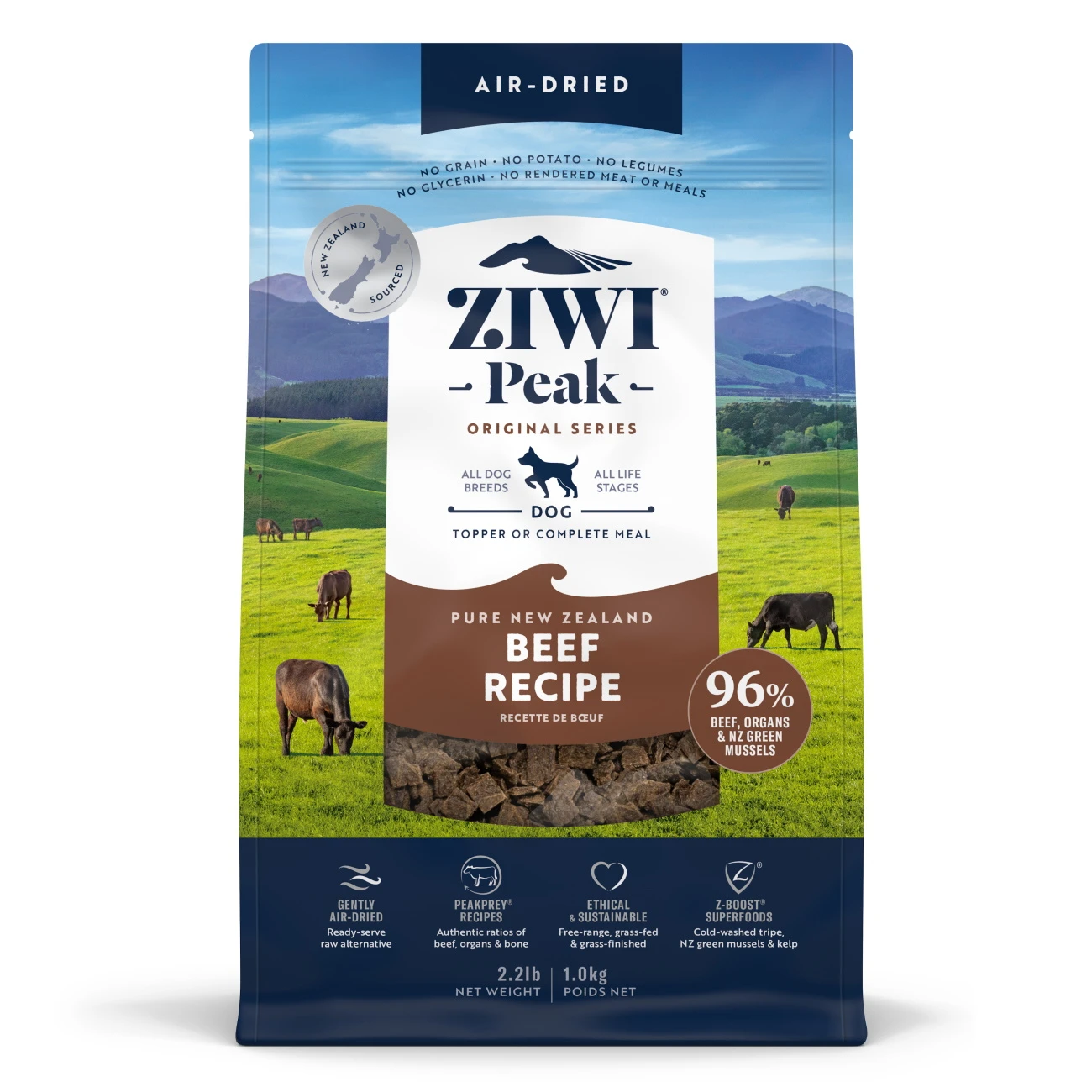 Ziwi Peak Air Dried Beef Air-Dried Food is a nutritious formula with great flavor and contains 96% Beef, Organs and Bone. Ziwi produces complete and balanced diets which are is proudly made in New Zealand. The Beef is sourced from local New Zealand farms, ensuring the animals are free-ranging, grass-fed and finished. Ziwi only sources the highest quality beef for this dehydrated recipe. Kelp is included in this recipe as a natural vitamin and mineral source, and New Zealand Green Mussel which is a natural source of glucosamine and chondroitin. The gentle twin-stage, air-drying process eliminates pathogenic bacteria while naturally preserving and protecting the nutrients in all of the ingredients. Ziwi air dried foods are highly digestible and loaded with protein.